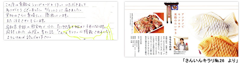この度は素敵なショップカードを作っていただきまして、ありがとうございました。実物はさらに素晴らしく感謝しています。また注文させてもらいます。鳥取県中部の田舎町で小さなたいやき屋を始めて3年になります。同封しました山陰の季刊誌「さんいんキラリ」に掲載されました。よろしければ読んでみて下さい。